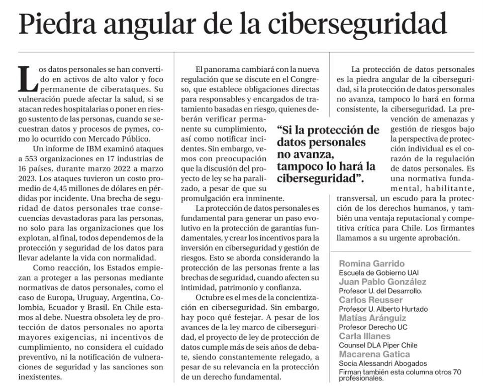 La protección de datos personales es la piedra angular de la ciberseguridad, si la protección de datos personales no avanza, tampoco lo hará en forma consistente, la ciberseguridad. La prevención de amenazas y gestión de riesgos bajo la perspectiva de protección individual es el corazón de la regulación de datos personales. Es una normativa fundamental, habilitante, transversal, un escudo para la protección de los derechos humanos, y también una ventaja reputacional y competitiva crítica para Chile. Los firmantes llamamos a su urgente aprobación.