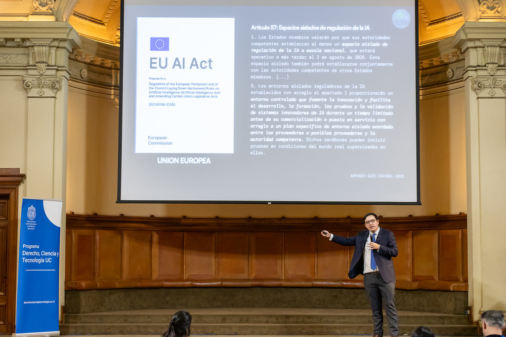 Matías Aránguiz, subdirector del Programa de Derecho, Ciencia y Tecnología UC, analizó los desafíos de combinar principios jurídicos y criterios técnicos para crear marcos regulatorios más efectivos frente a tecnologías emergentes. Haz clic aquí para ver la presentación de Matías Aránguiz.